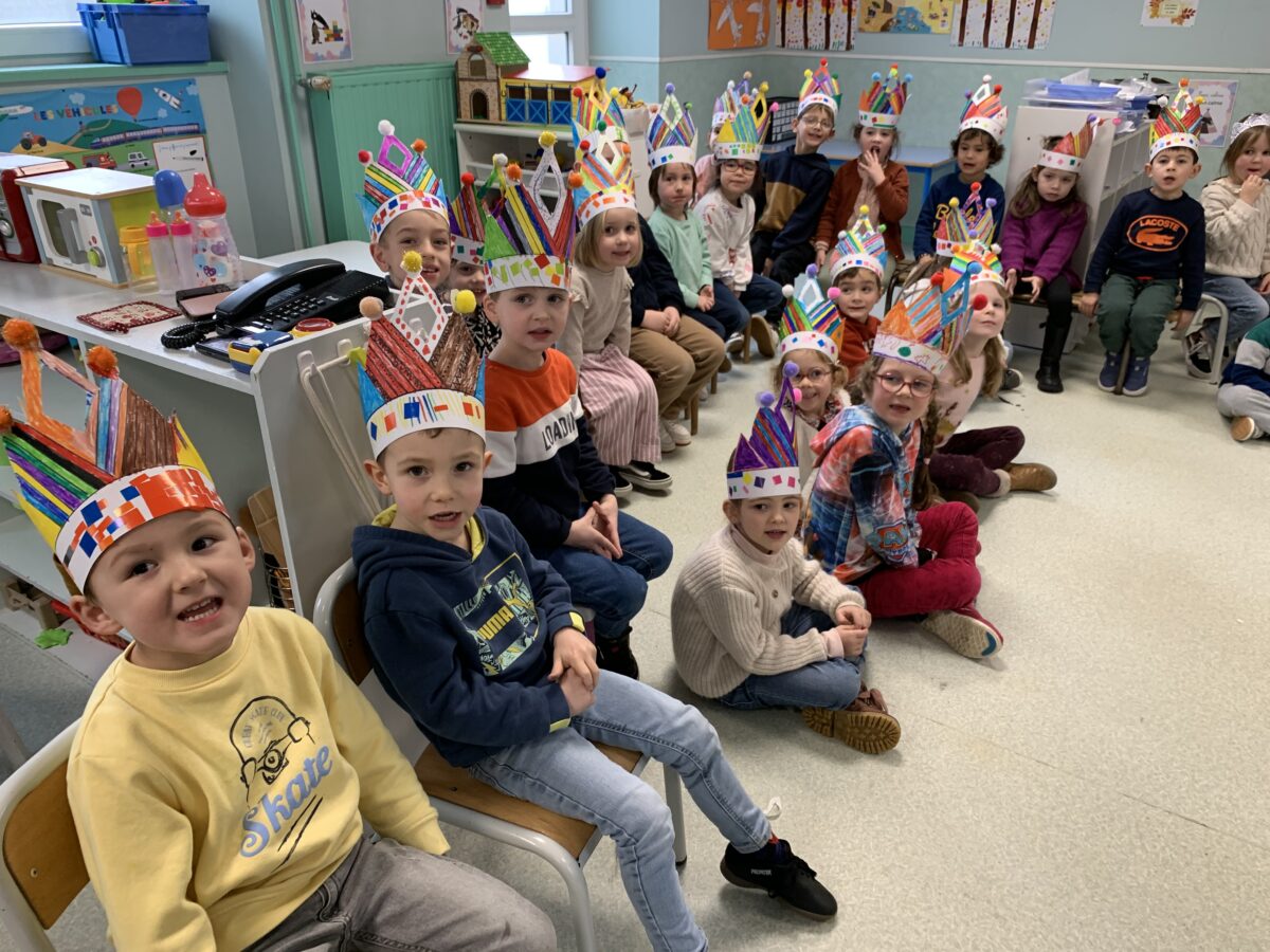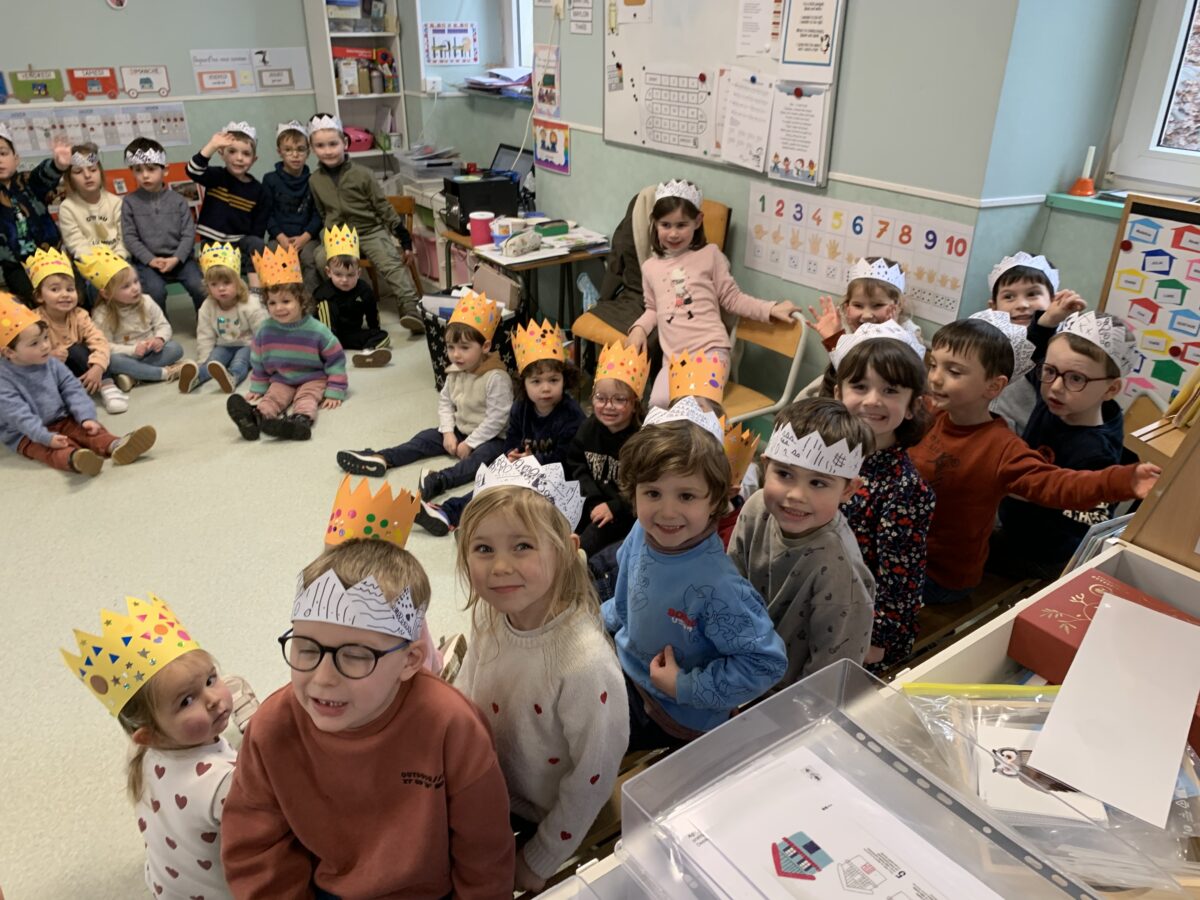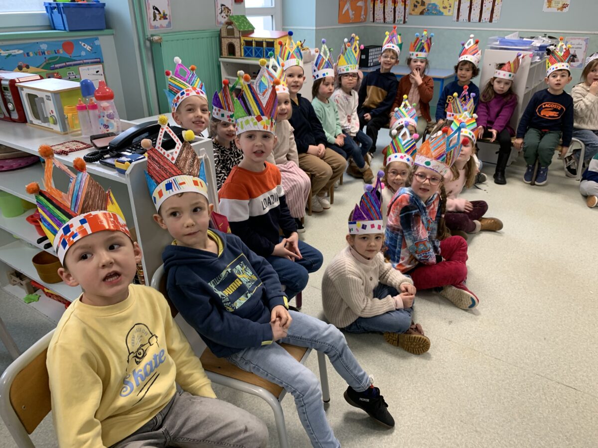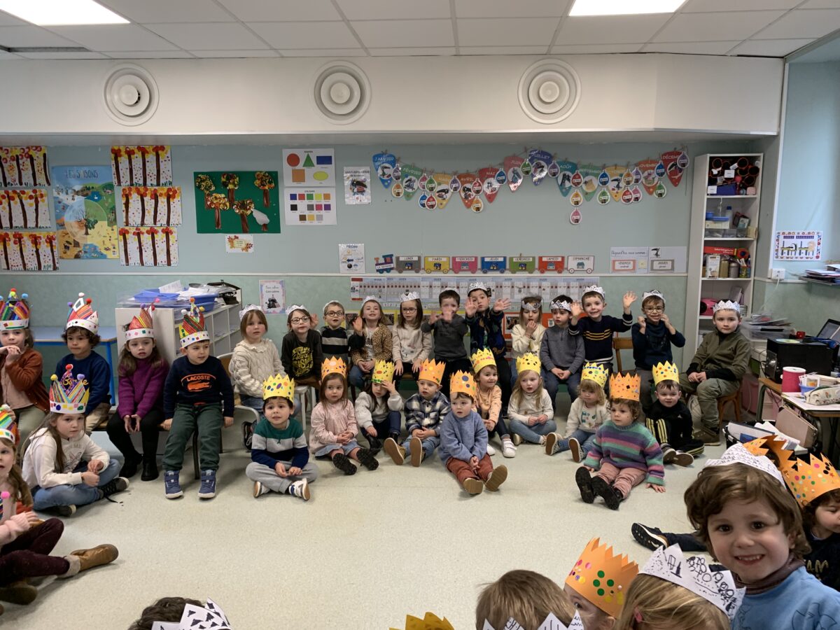 Le vendredi 30 janvier, tous les élèves des trois classes se sont retrouvés pour partager la galette des rois. Auparavant, chaque classe avait préparé deux galettes. Chaque élève avait également confectionné une couronne.